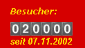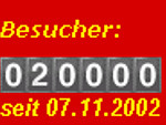 Wie im Gästebuch bereits angekündigt wurde, hat soeben - es ist 10:00 Uhr am 20. Juli 2005 - der 20000. (in Worten: Zwanzigtausendster) Besucher unsere Homepage besucht. Umgerechnet ergibt sich also eine Besuchsfrequenz von mehr als 20 Besuchern pro Tag.