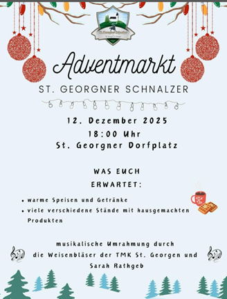 Unsere St. Georgner Schnalzergruppe veranstalten auch Euer wieder einen Adventmarkt. Eine Bläsergruppe von uns ist natürlich mit dabei. Vielleicht habt ihr Zeit, Lust und Laune am 12.12.25 nach St. Georgen zu kommen, gemeinsam einen besinnlichen Vorweihnachtsabend zu feiern und einige kulinarischen Köstlichkeiten zu genießen!